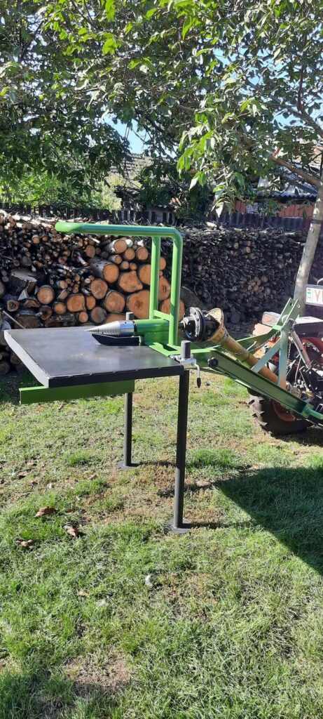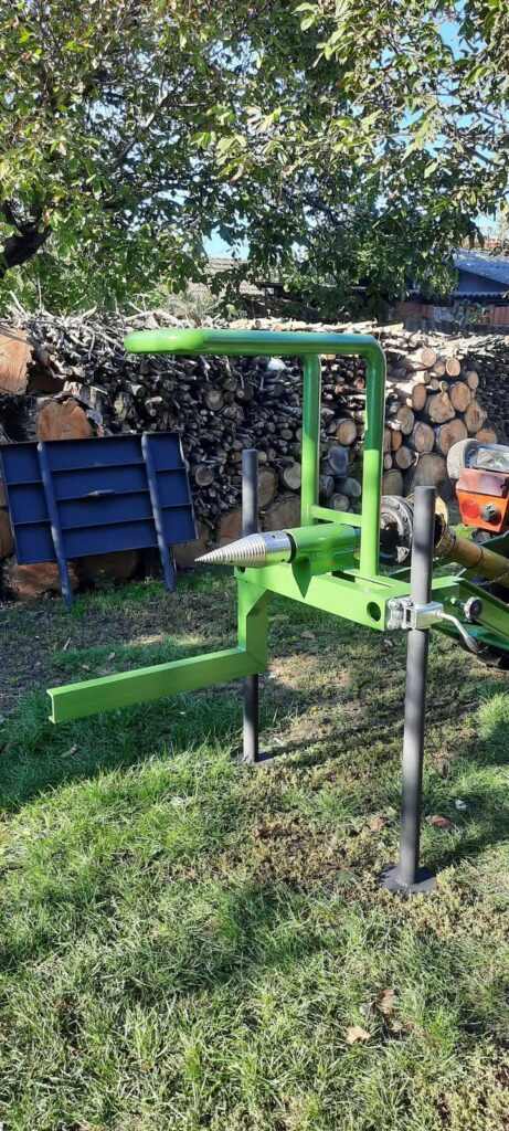 Öntől vásárolt 90mm kardán csonkos szettből építettem egy kugli és méterfa hasításra is alkalmas gépet. Fokozat mentesen állítható magasságú,kivehető asztalú. A kugli és méterfánál is elláttam elfordulás gátlóval, ami sokkal biztonságosabbá teszi a kezelést. Kat1. és kat.2 3 pontos felfüggesztést kapott. MHU 80 ,10mm lapos acélokból, 6/4″ fekete csövekből áll a fő váz. Az asztal 5mm MH lemezből készült,kimerevítve. Ami alatt kapott helyet a póthegy tartó. Egy biztonsági kerettel is elláttam,aminek szerepe a méterfa hasításánál válik fontossá. Nem enged odalépni a kúphoz.