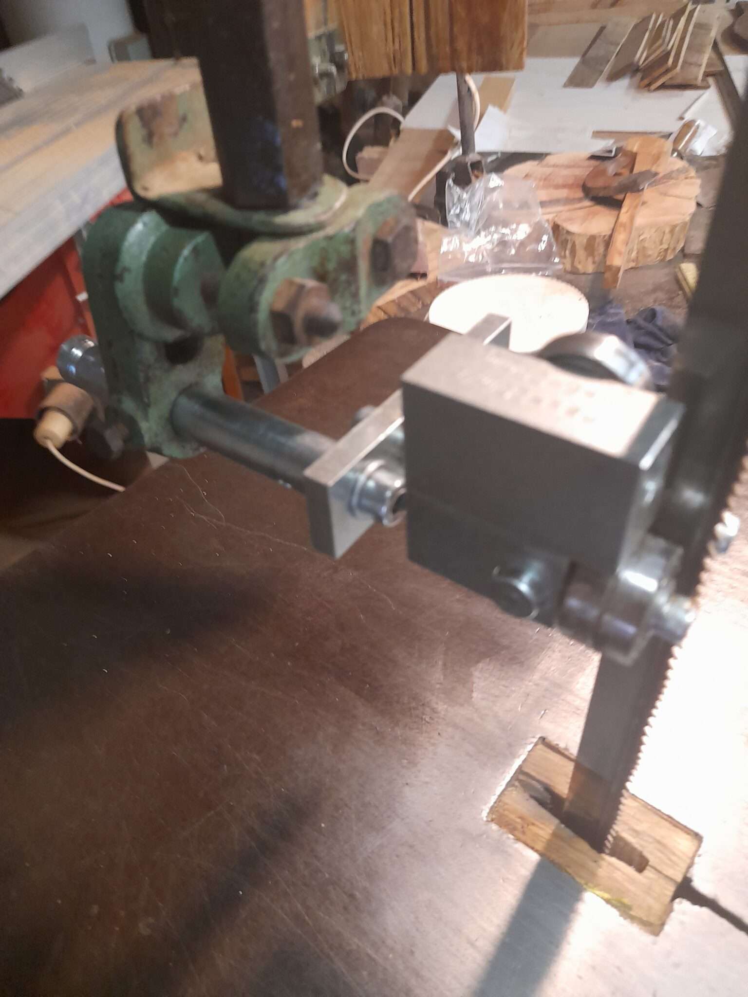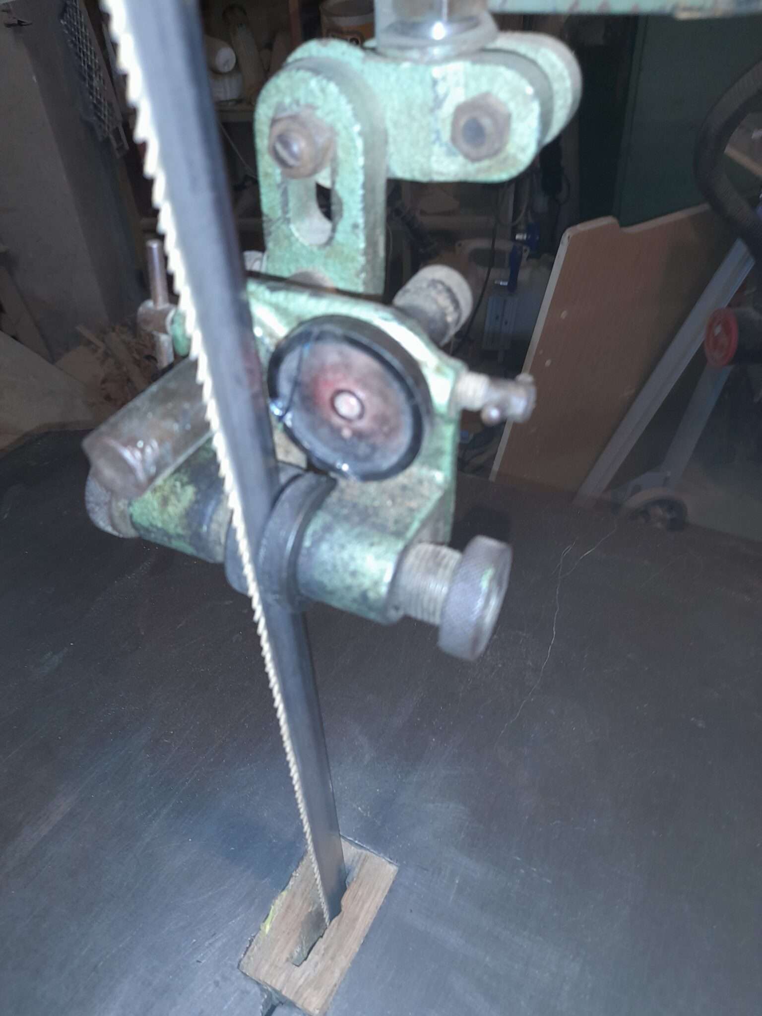 Az új lapvezető beépítve. Érdekesség: a szalagfűrészen váltakozó fogazású, eredetileg fémipari bi-metál szalagfűrészlap van. Amikor a fémet már nem megfelelően vágja egy ilyen lap, fához még hosszú-hosszú ideig használható.