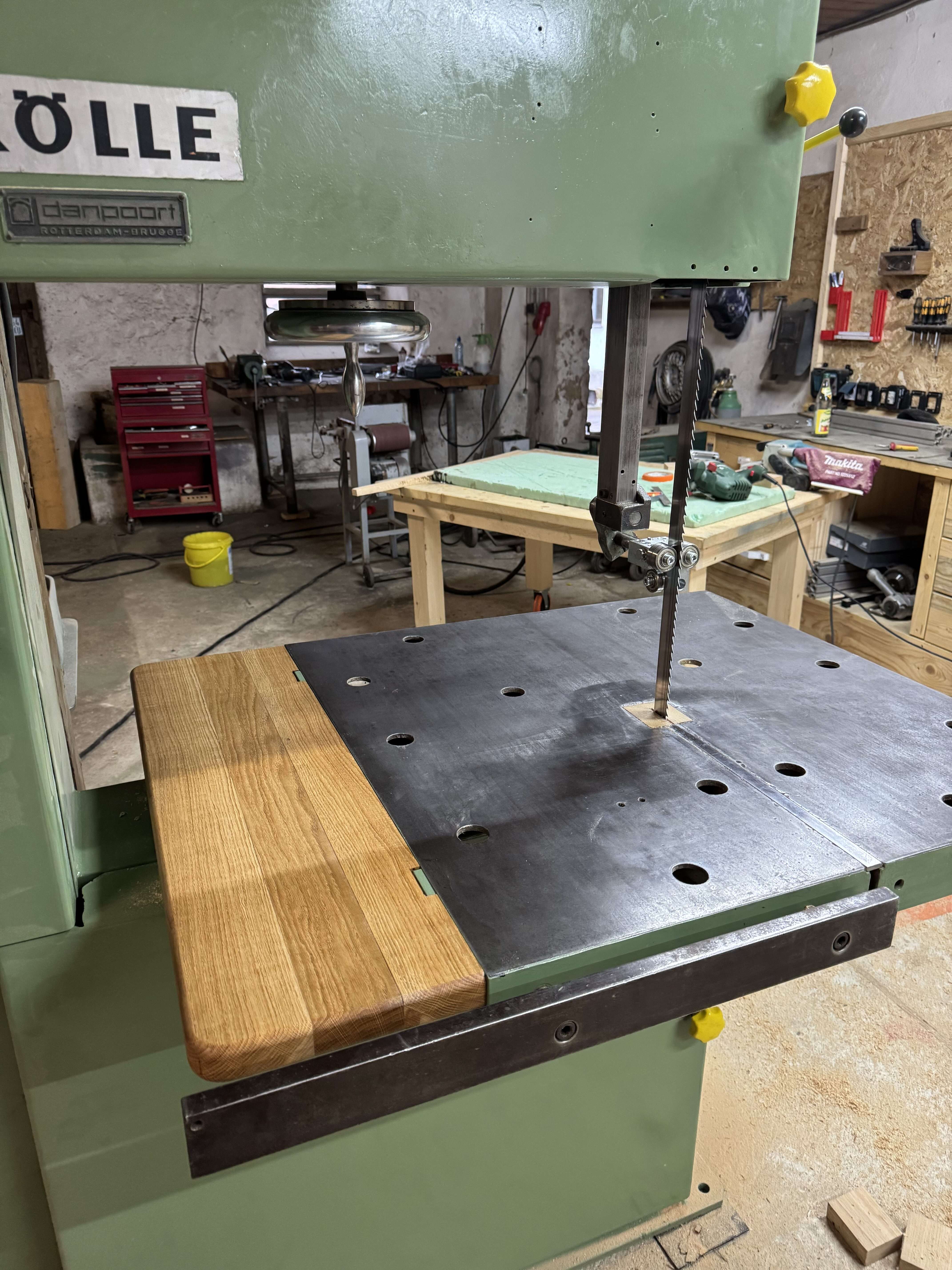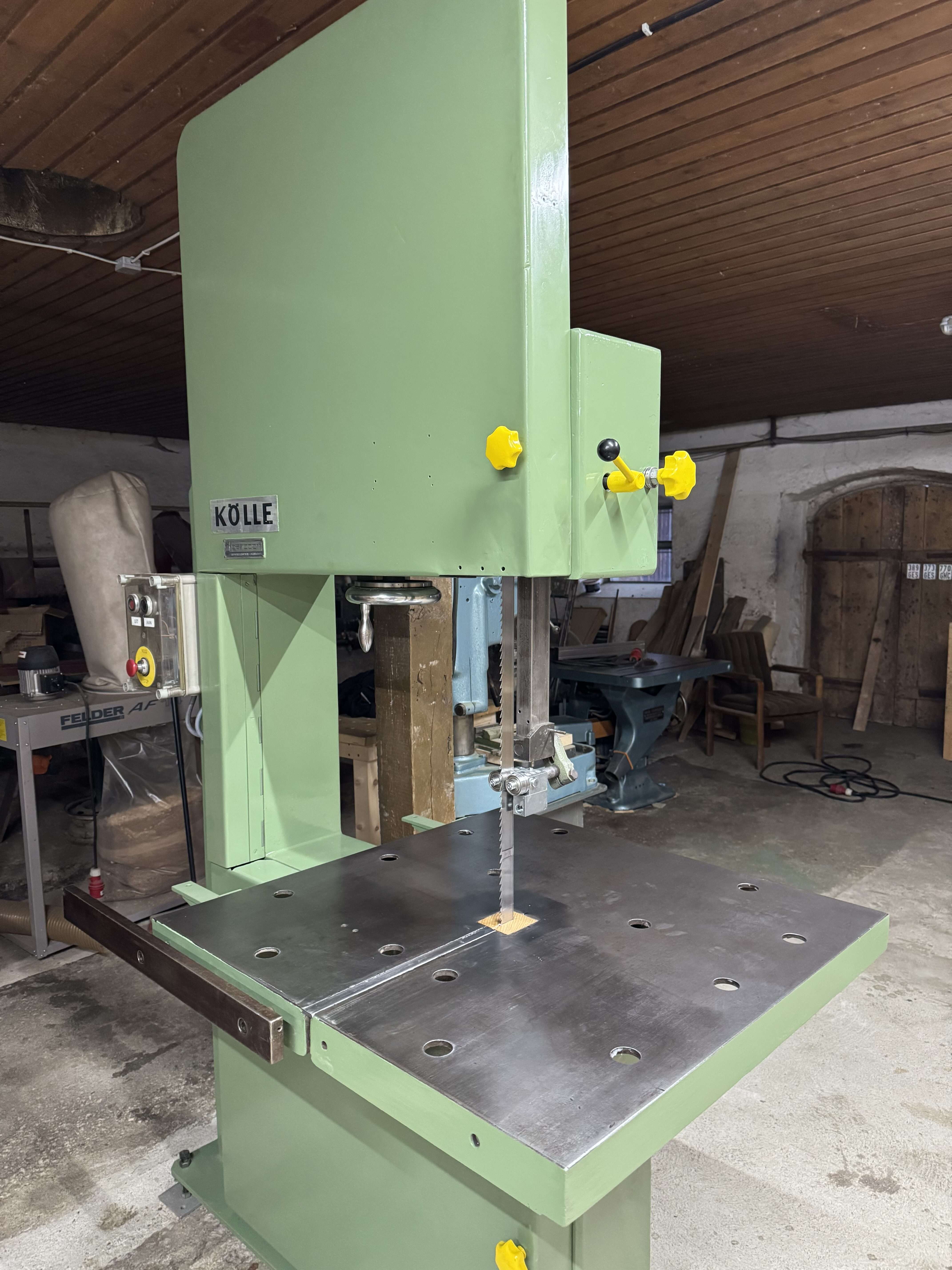 Vásárlónk egy Kölle gyártmányú, 600 mm kerékátmérőjű szalagfűrészen cserélte le a felső, gyári lapvezetőt egy 5×5-ös lapvezetőre.
