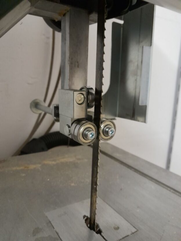 Ismét a 4×4-es lapvezetőnk van rivaldafényben. Most egy Metabo BS 0633 típusú szalagfűrészre került fel. A gyári tartókonzol szinte tökéletesen megegyezett a lapvezető felfogatásával, így jelen esetben is rendkívül egyszerű volt a csere.