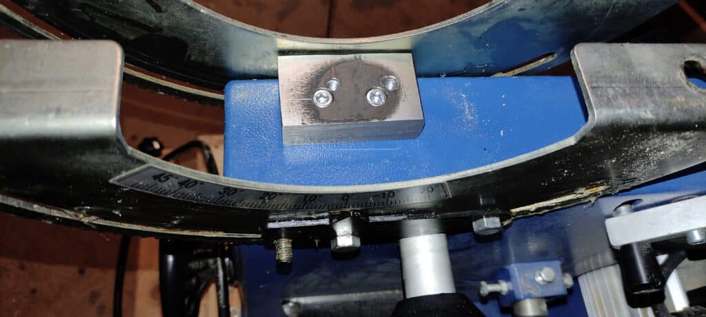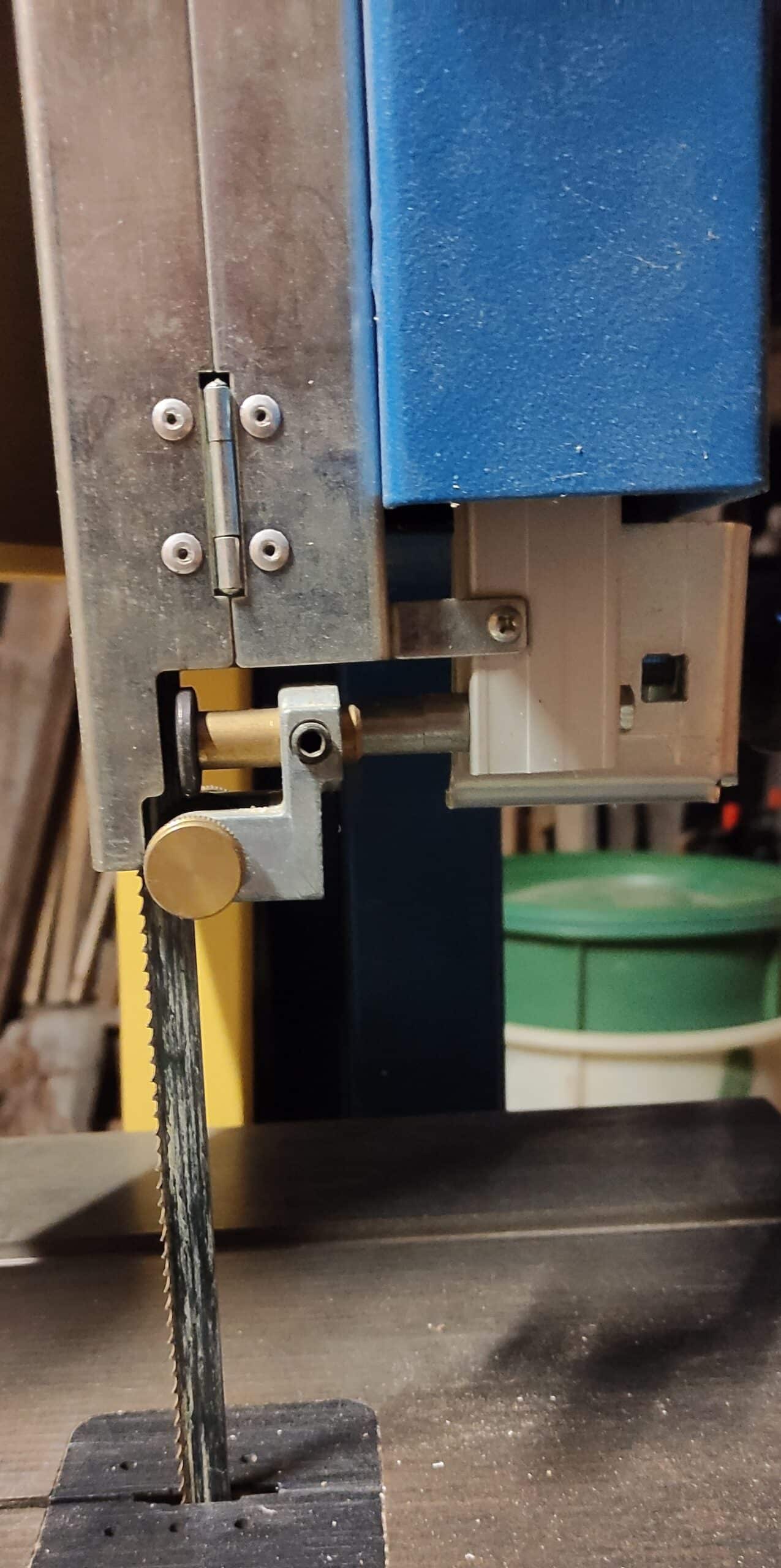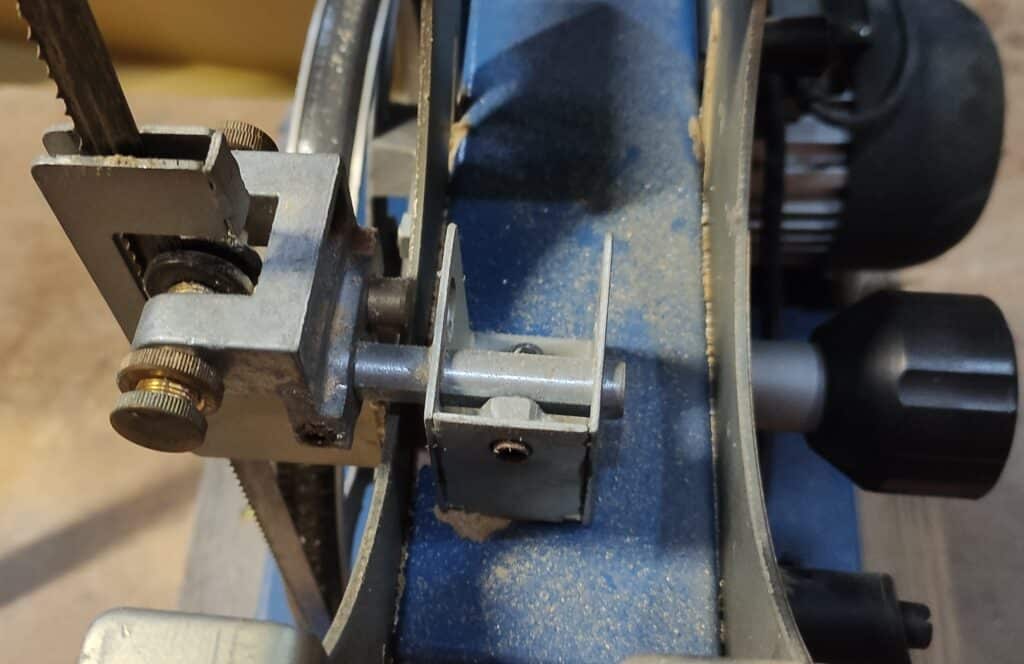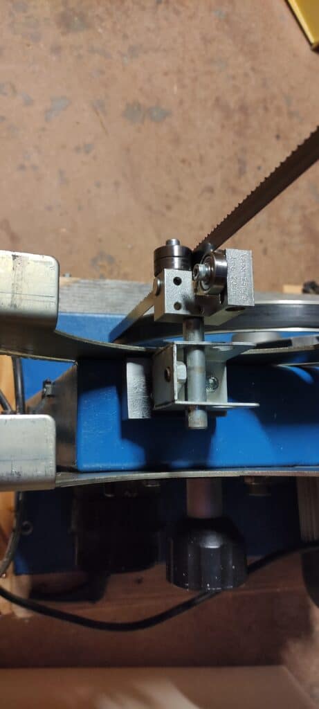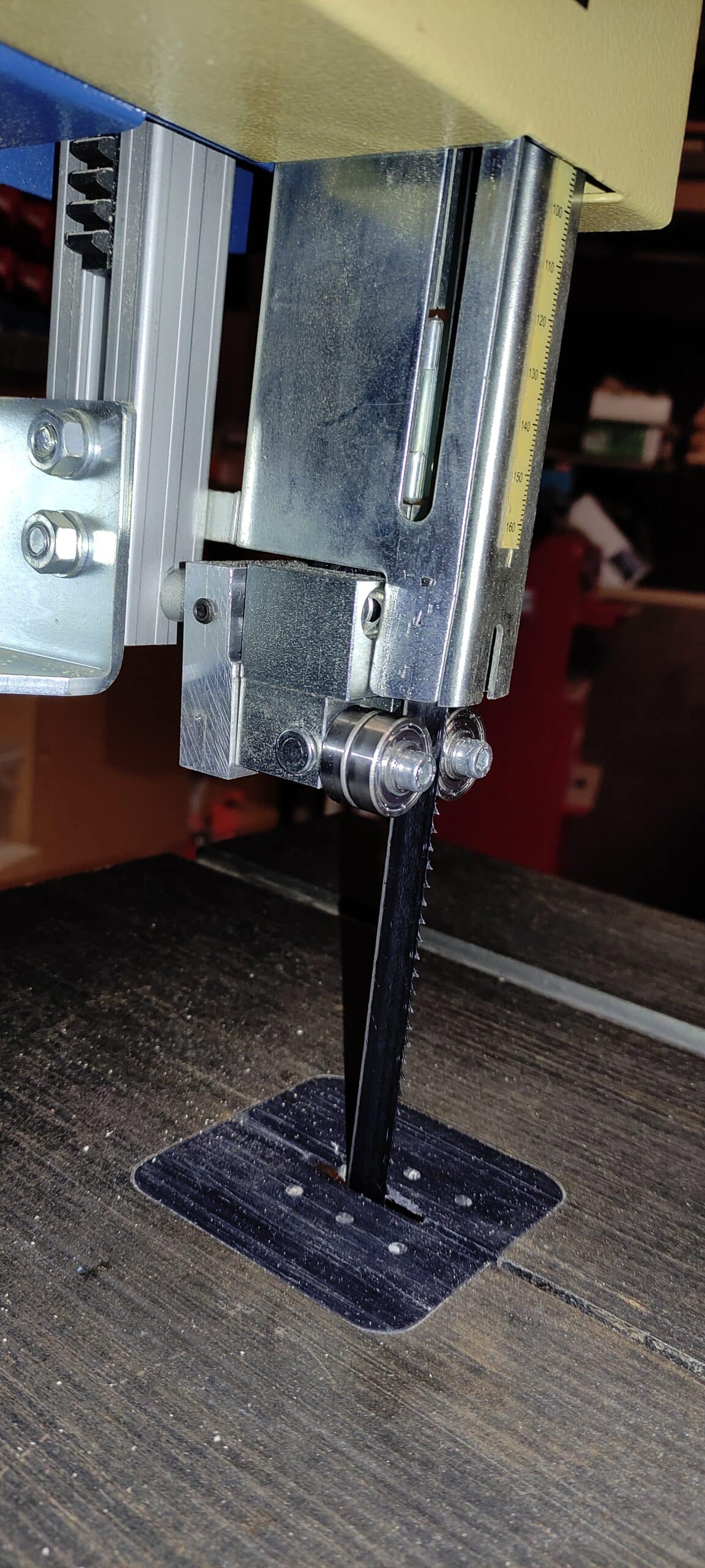 Rögzítsük az adapterblokkot imbuszcsavarokkal az eredeti furatokba (Kép 12). Kapcsoljuk össze az új alsó vezetőt a csapágytartóval. Ehhez az elülső 12 mm-es köracélt 10 mm hosszan d10-re alakítsuk ki, és fent és lent a hernyócsavarokkal biztosítsuk. A lapvezetőt helyezzük az adapterblokkra, majd igazítsuk az új szalagvezetést a feszített fűrészlapra, hogy megjelöljük a két furat helyét. Ezután fúrjunk 5 mm-es lyukakat (magfuratátmérővel) és vágjunk bele M6 menetet. A lyukak pozíciójának nem kell pontosnak lennie, mivel az alsó csapágytartóban hosszlyukak vannak.