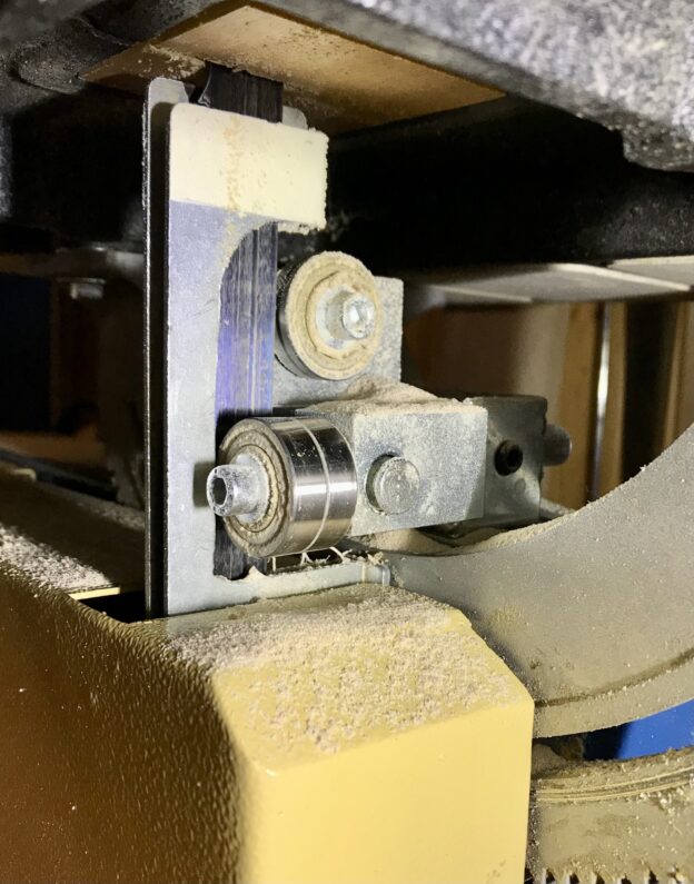 Vevőnk félelme alaptalan volt az ügyben, hogy majd az alsó lapvezető eltömődik a ráhulló nagy mennyiségű fűrészportól. Jól látható, hogy az alsó lapvezetőn meglehetősen sok fűrészpor van, azonban a csapágyak tiszták, nem ragad meg rajtuk a fűrészpor még nedvesebb fa vágása esetén sem. Néhány kép, hogy most milyen minőségben dolgozik a gép: