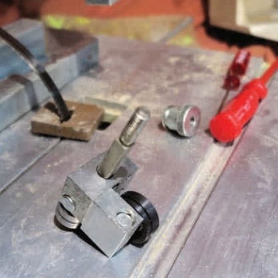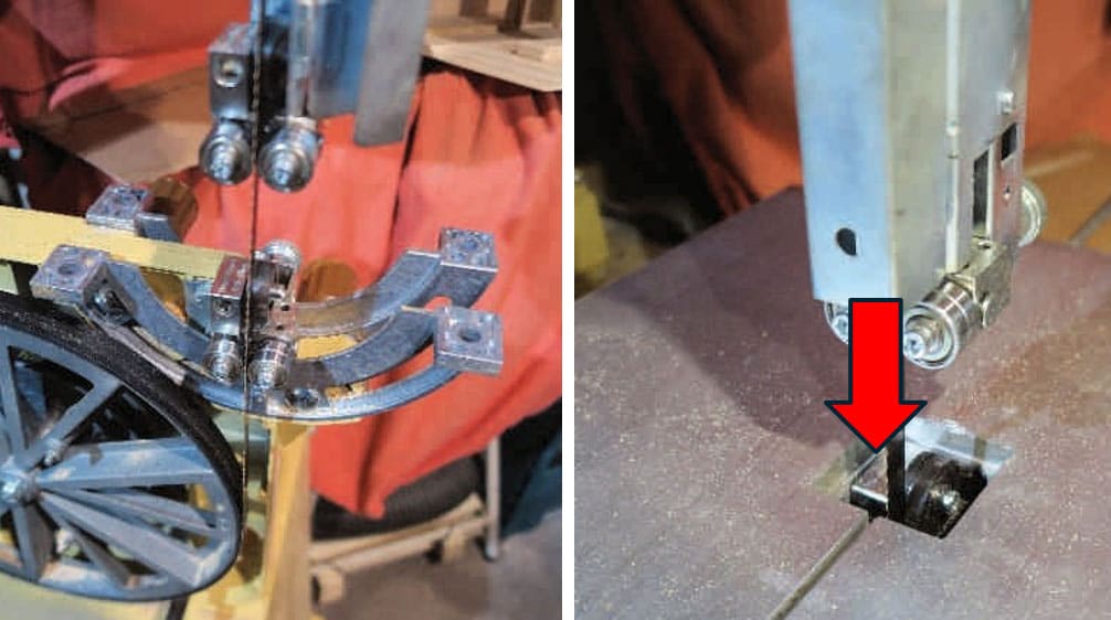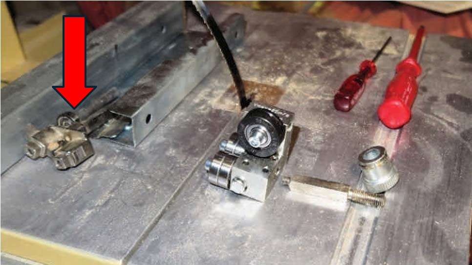 A következő két kép bal oldalán, nyíllal jelölve, az én régi fűrészlapvezetésemet láthatjátok a Hasito.hu-változat mellett, míg jobb oldalon az eredeti pótalkatrész, amelyről teljesen elkopott.