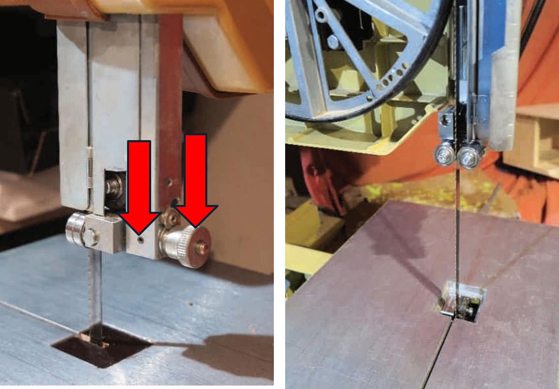 A következő két kép bal oldalán, nyíllal jelölve, az én régi fűrészlapvezetésemet láthatjátok a Hasito.hu-változat mellett, míg jobb oldalon az eredeti pótalkatrész, amelyről teljesen elkopott.