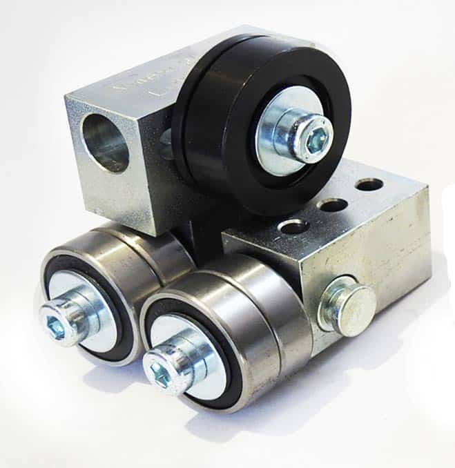 Az íves, kanyarító vágásokhoz készült fűrészlapvezetők felső támasztócsapágya egy külső acélpersellyel van ellátva. A perselyben lévő horony nagyon pontosan vezeti a fűrészlapokat, így a szűk ívek még precízebben vághatók. Az acélpersely pótalkatrészként is kapható, és nagyon egyszerűen átszerelhető. A persely 55 HRC keménységűre van edzve és a felületkezelésnek köszönhetően (vegyi barnítás) fekete színű.